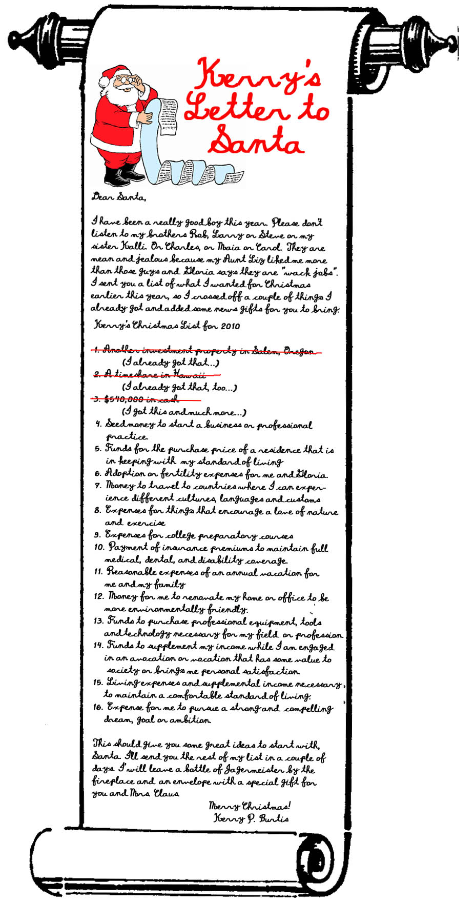 - Expenses for Kerry, individually and with his spouse and/or children, to pursue, on a one time basis, a strong and compelling, but not necessarily practical dream goal or ambition.