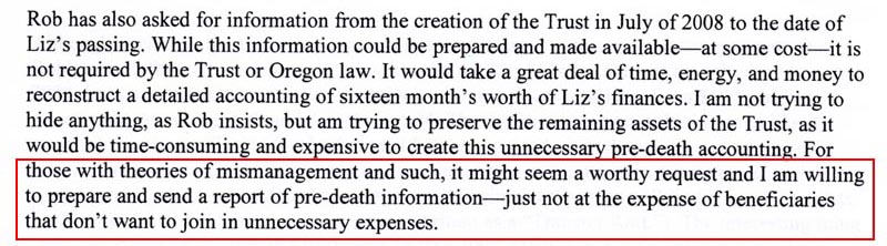 Kerry emphasizes just how "unnecessary" any pre-death accounting would be, but says he is "willing to prepare and send a report". And yet when asked specifically for information pertaining to the actual value of the estate on the day the revised "Revocable Trust Agreement" was signed, Kerry resfuses to respond and the lawyers remain silent. And I personally offered to pay for any expenses in making this information available, out of my own pocket and at no expense to the estate or any of the other beneficiaries. ![]() |